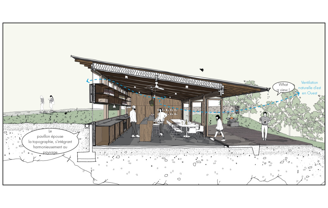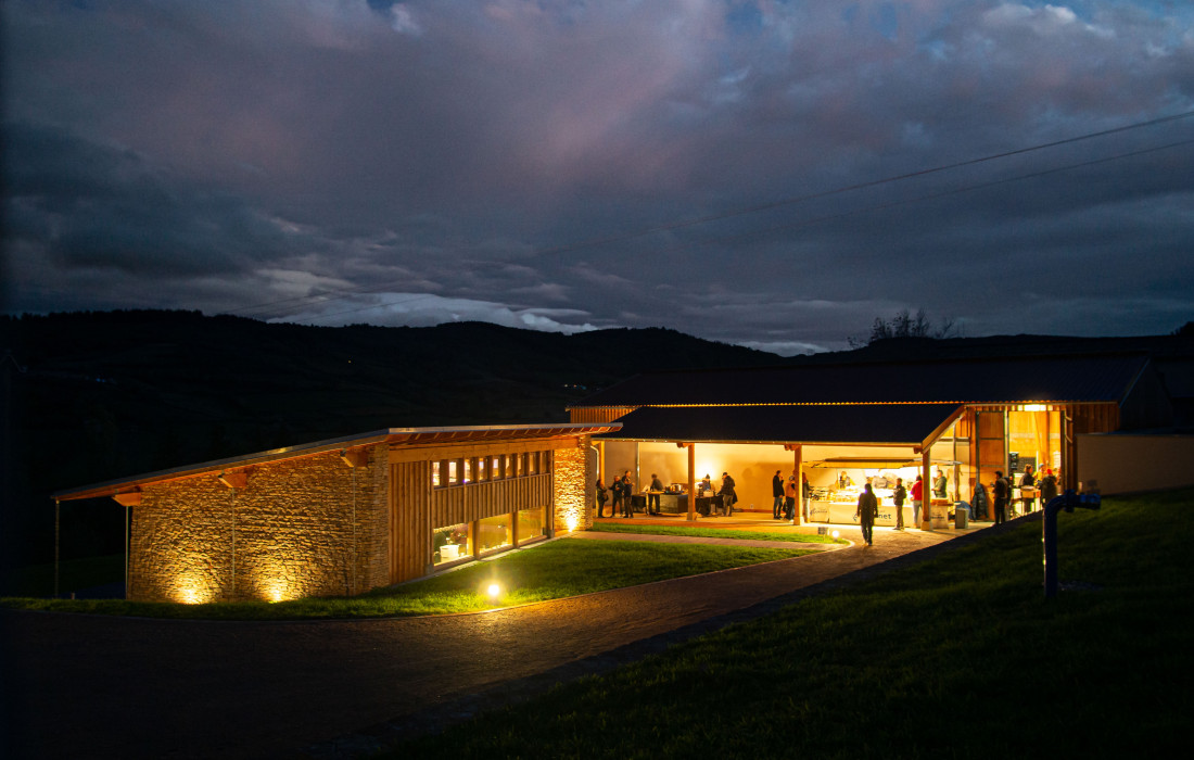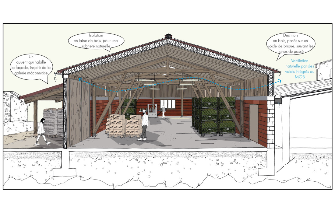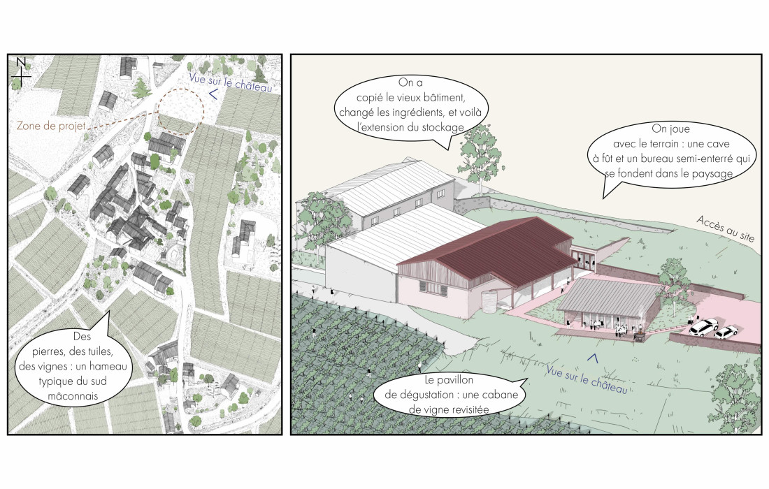Le projet est né d'une collaboration heureuse entre deux agences d'architecture et un domaine viticole : Le Local, Atelier Wow et le Coteaux des Margots. Le domaine souhaite créer une extension de leur chai viticole pour agrandir leur cuvage et créer un espace dédié à l’accueil des touristes. Nous avons alors proposé une extension reprenant la géométrie existante du cuvage pour prolonger leur espace de stockage ainsi qu’un pavillon indépendant pour recevoir les visiteurs. Ce pavillon est ouvert sur le grand paysage des vignes et offre une vue imprenable sur le Château de Pierreclos, monument inscrit.